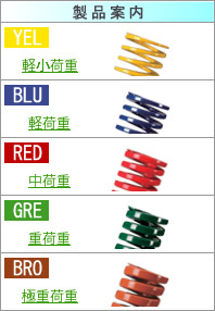 DAIspringは軽小荷重、軽荷重、中荷重、重荷重、極重荷重の規格があり、それぞれカラー塗装で色分けしてありますので、容易に選択できます。 |